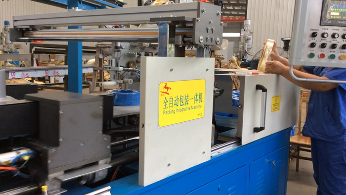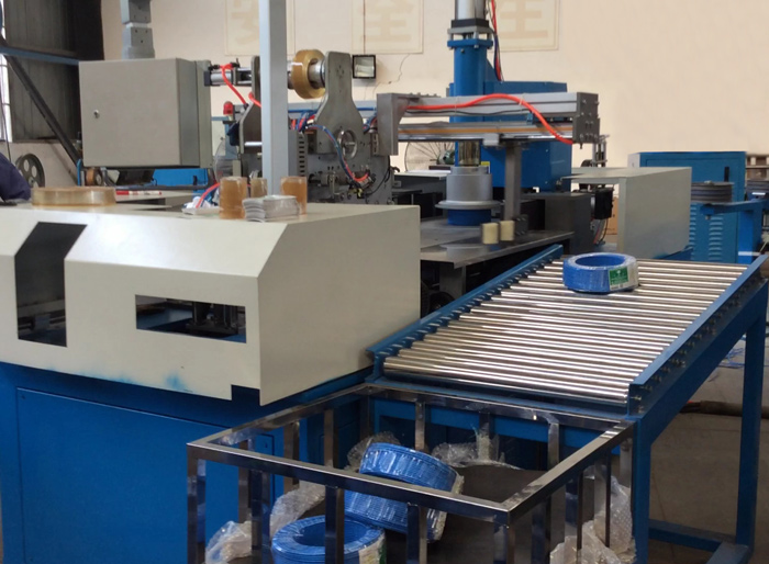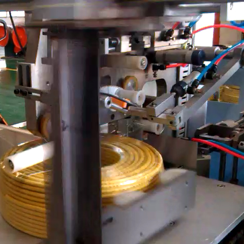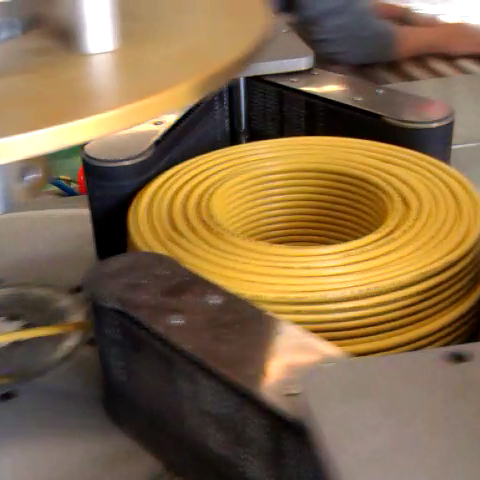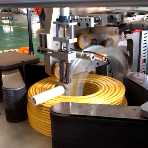 • 功能:   進(jìn)線、成圈、計(jì)米、剪斷、貼標(biāo)簽、包膜、推出一氣呵成